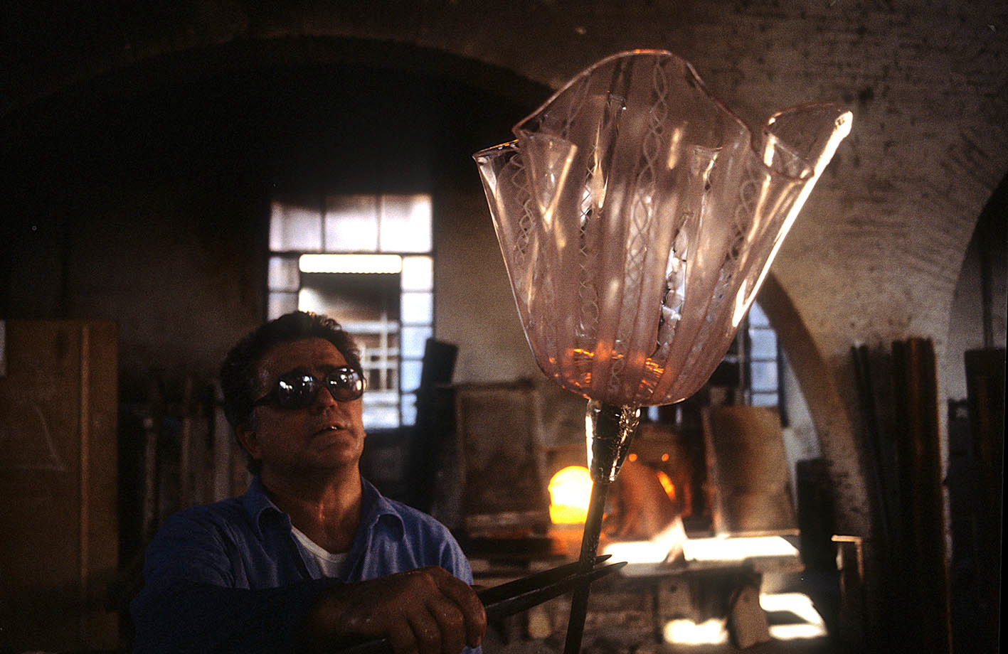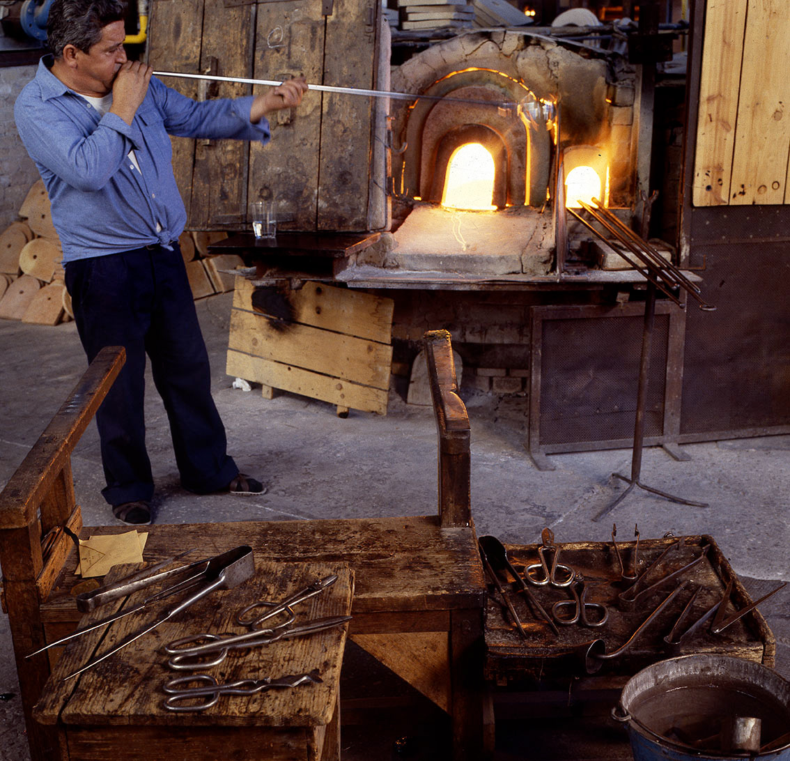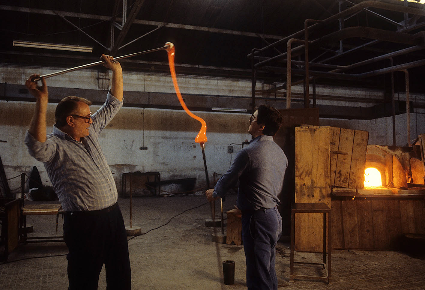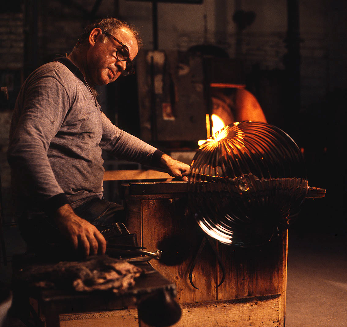 Chiunque abbia potuto entrare in una fornace muranese e assistere alla creazione di un manufatto in vetro, rimane folgorato dal fascino di tecnica, movimenti, gesti che trasformano un fluido apparentemente ingovernabile, in un oggetto modellato e solido, in grado di conservrsi per sempre. Questa magia è quotidianamente rivelata da uomini - e oggi anche qualche donna - che si chiamano vetrai e operano in quest'isola da oltre un millennio, e cioè da quando la Repubblica di Venezia vi trasferì le fornaci che producevano vetro con il fuoco dei forni e che costituivano un rischio mortale per una città in gran parte - e ancor oggi negli edifici storici - edificata col legno. La composizione del vetro di Murano - ricco di sodio - ne rende possibile la lavorazione a caldo e ne permette la soffiatura, la modellazione, e l'aggiunta di impasti colorati, dando luogo a oggetti policromi di grande bellezza e leggerezza. Con i secoli, tecniche e maestria hanno permeddo di creare, oltre a quelli di uso quotidiano (bicchieri, bottiglie, lampade e lampadari)i, ogni sorta di oggetti in vetro soffiato e massiccio., trasformando queste lavorazioni in una produzione "artistica". E di artigianato alto si deve parlare per la qualità - progettuale e esecutiva - che caratterizza questa lavorazione. Ho avuto modo di fotografare molti degli ultimi grandi maestri del Novecento. Spero di riuscire a continuare oggi a raccontare questo "miracolo" che, dall'alba di ogni giorno, viene ancora rinnovato da - ormai poche - centinaia fra maestri, operai, "serventi" nelle "piazze" delle fornaci muraneri. Anche qui, la sfida è quella di rinnovarsi e crescere, formando nuove genereazioni di lavoratori e di desiner.