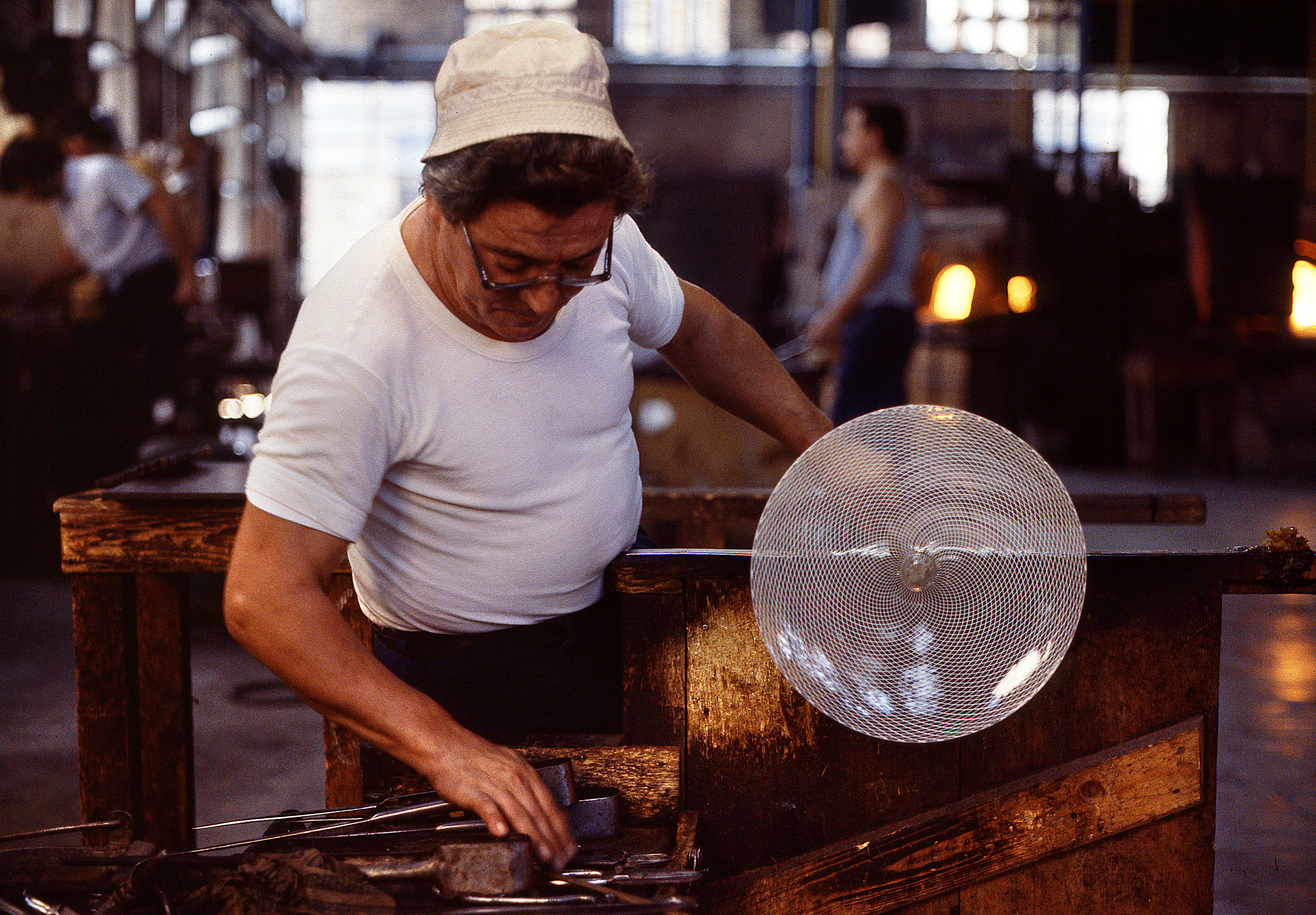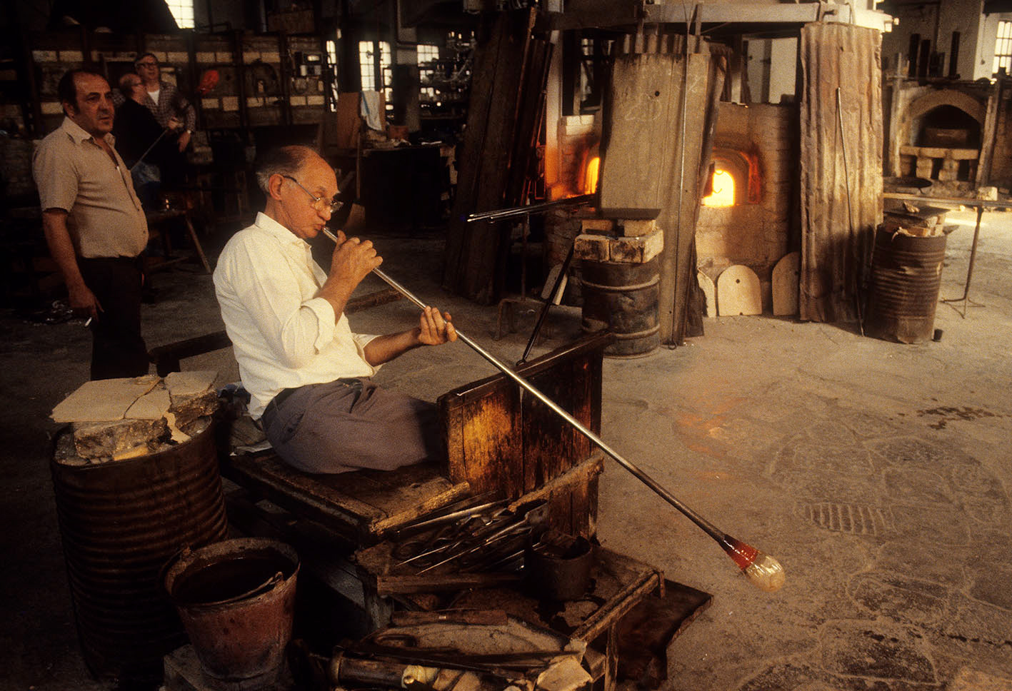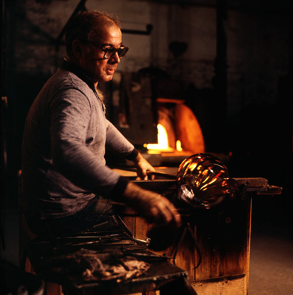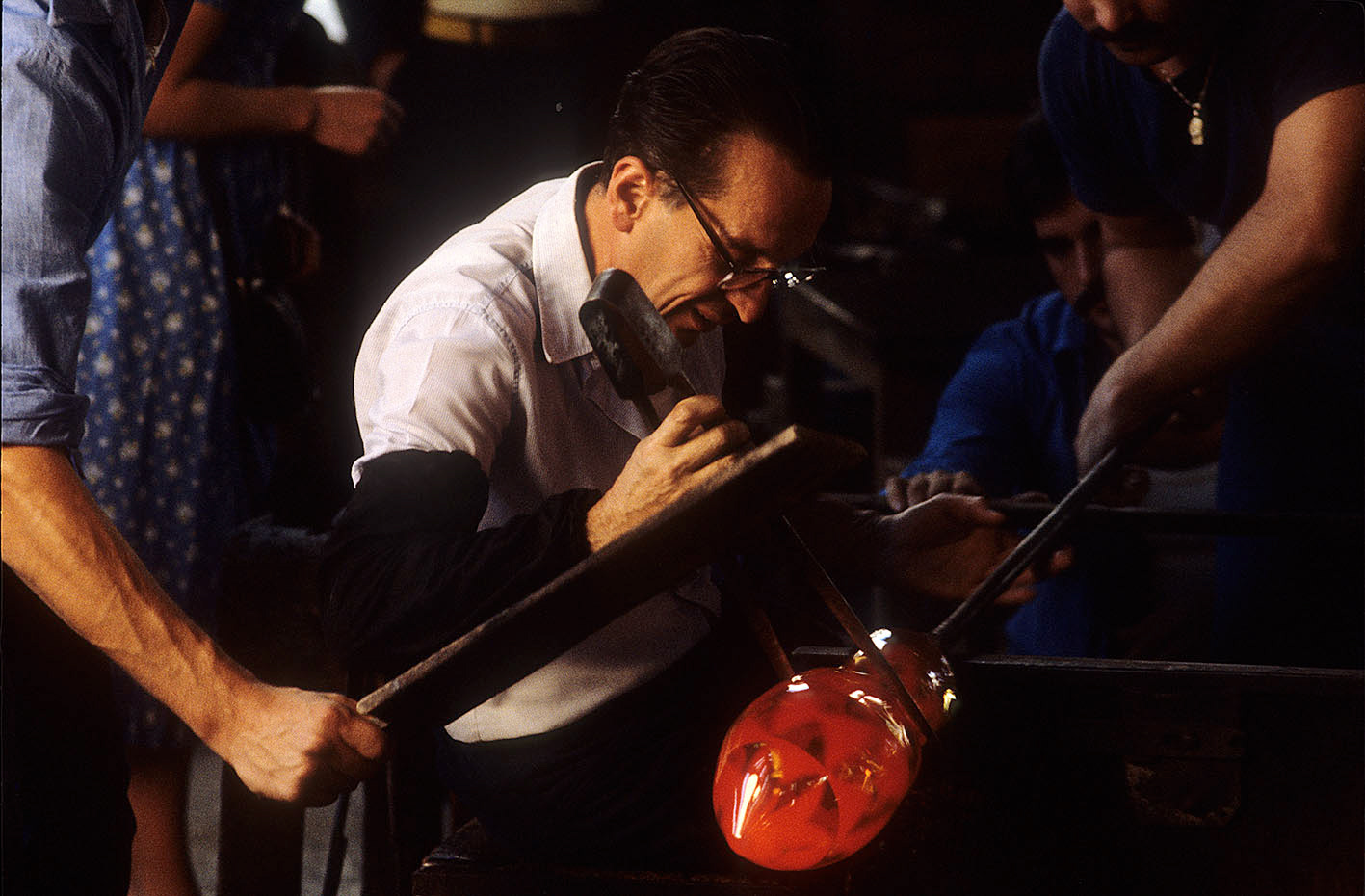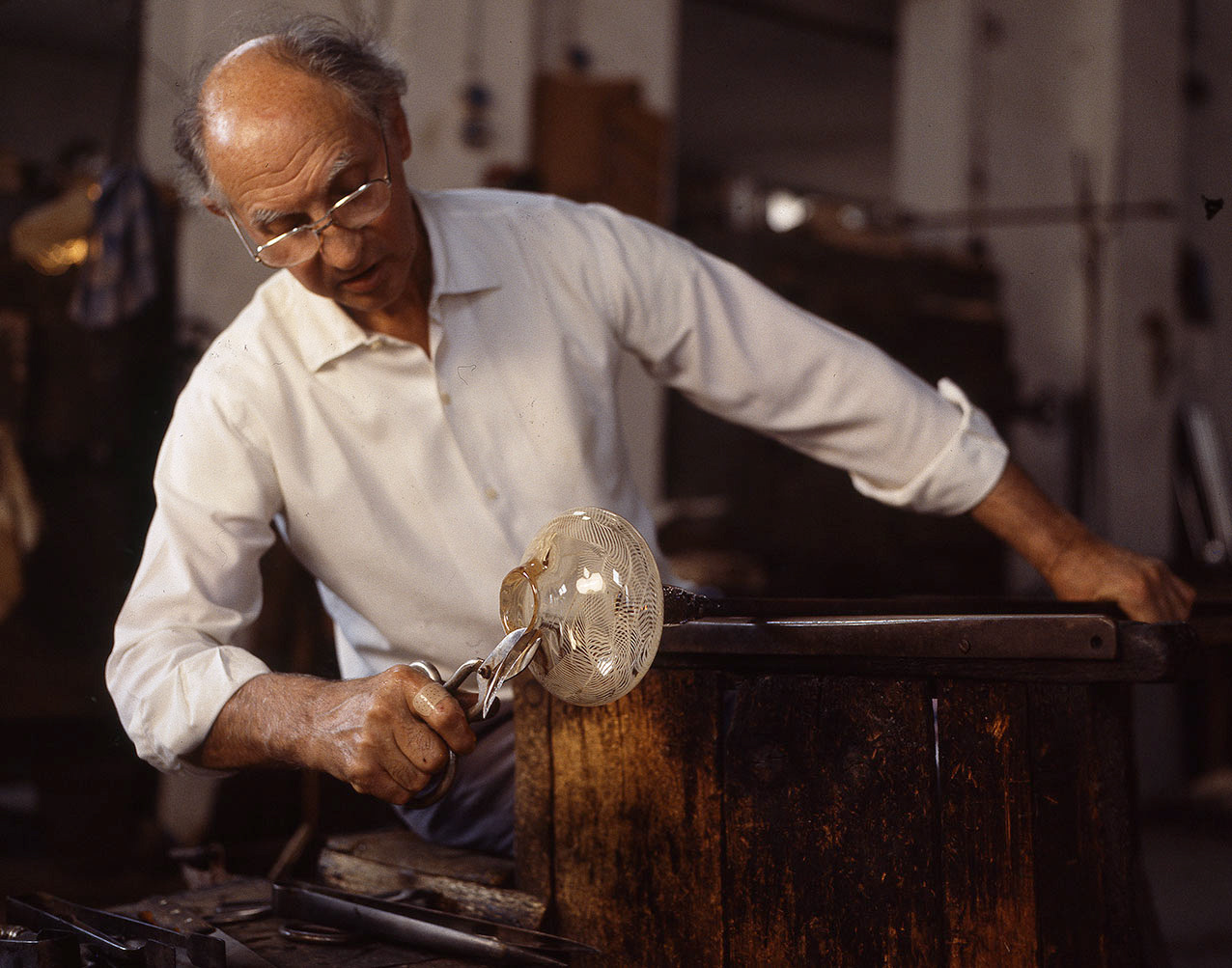 Chiunque abbia potuto entrare in una fornace muranese e assistere alla creazione di un manufatto in vetro, rimane folgorato dal fascino di tecnica, movimenti, gesti che trasformano un fluido apparentemente ingovernabile, in un oggetto modellato e solido, in grado di conservrsi per sempre. Questa magia è quotidianamente rivelata da uomini - e oggi anche qualche donna - che si chiamano vetrai e operano in quest'isola da oltre un millennio, e cioè da quando la Repubblica di Venezia vi trasferì le fornaci che producevano vetro con il fuoco dei forni e che costituivano un rischio mortale per una città in gran parte - e ancor oggi negli edifici storici - edificata col legno. La composizione del vetro di Murano - ricco di sodio - ne rende possibile la lavorazione a caldo e ne permette la soffiatura, la modellazione, e l'aggiunta di impasti colorati, dando luogo a oggetti policromi di grande bellezza e leggerezza. Con i secoli, tecniche e maestria hanno permeddo di creare, oltre a quelli di uso quotidiano (bicchieri, bottiglie, lampade e lampadari)i, ogni sorta di oggetti in vetro soffiato e massiccio., trasformando queste lavorazioni in una produzione "artistica". E di artigianato alto si deve parlare per la qualità - progettuale e esecutiva - che caratterizza questa lavorazione. Ho avuto modo di fotografare molti degli ultimi grandi maestri del Novecento. Spero di riuscire a continuare oggi a raccontare questo "miracolo" che, dall'alba di ogni giorno, viene ancora rinnovato da - ormai poche - centinaia fra maestri, operai, "serventi" nelle "piazze" delle fornaci muraneri. Anche qui, la sfida è quella di rinnovarsi e crescere, formando nuove genereazioni di lavoratori e di desiner.