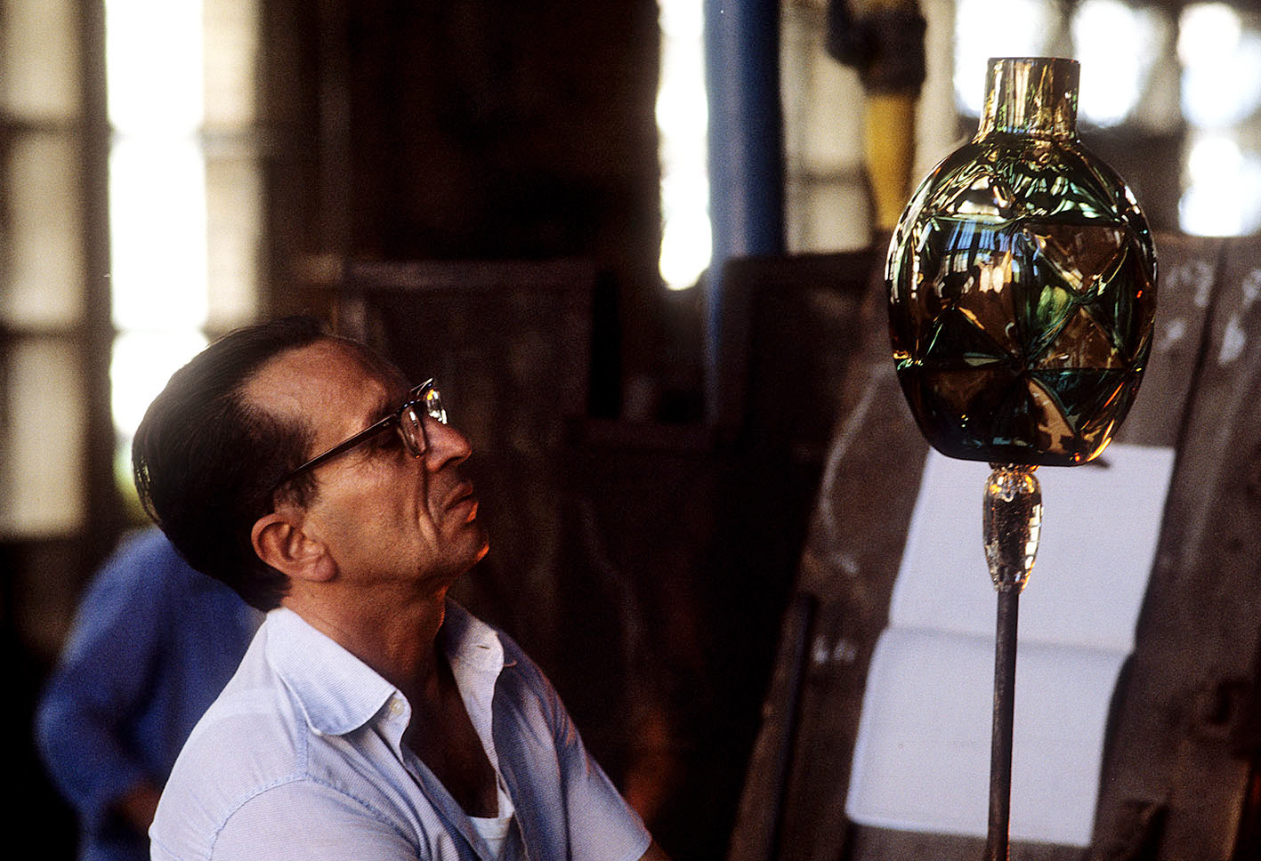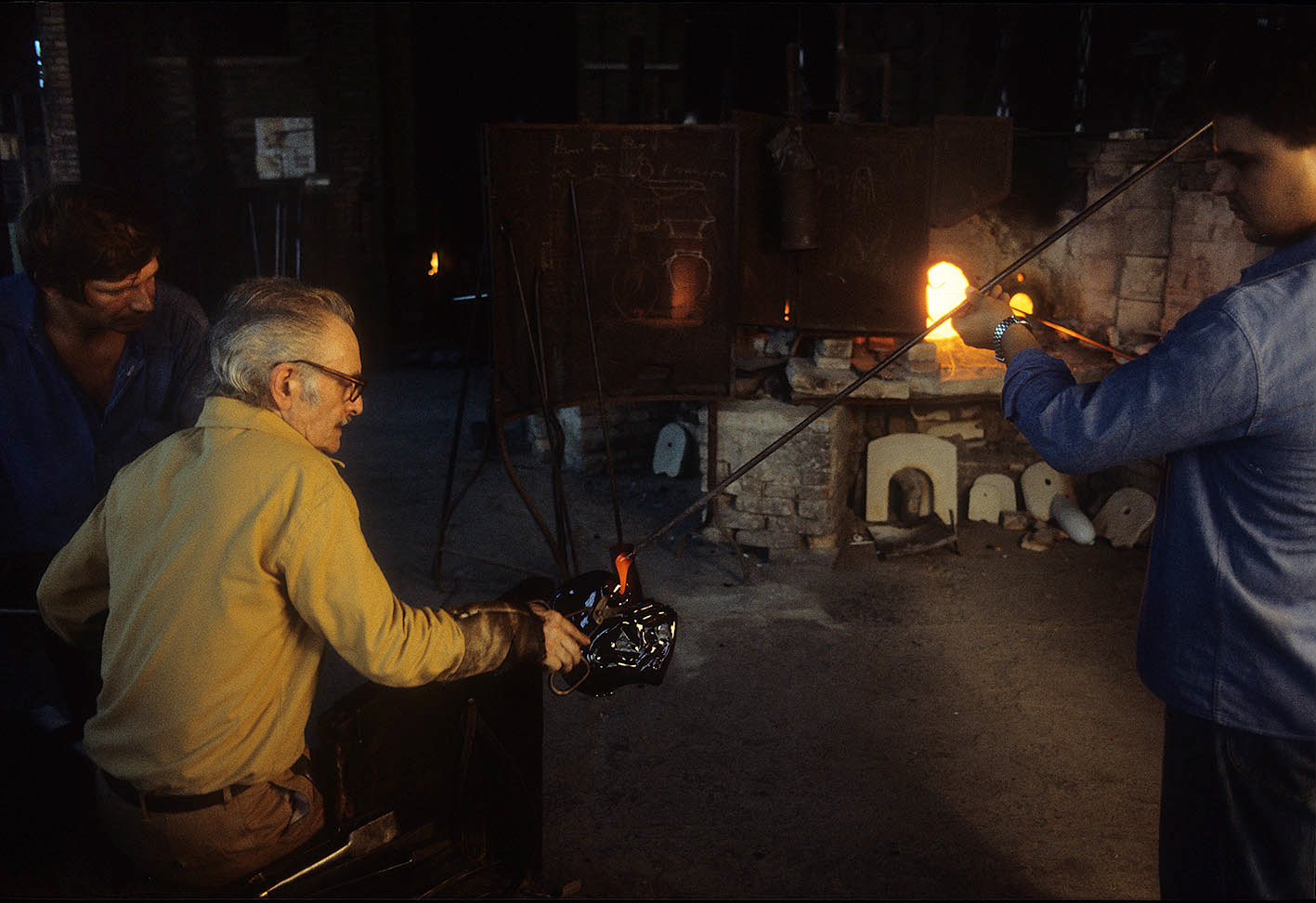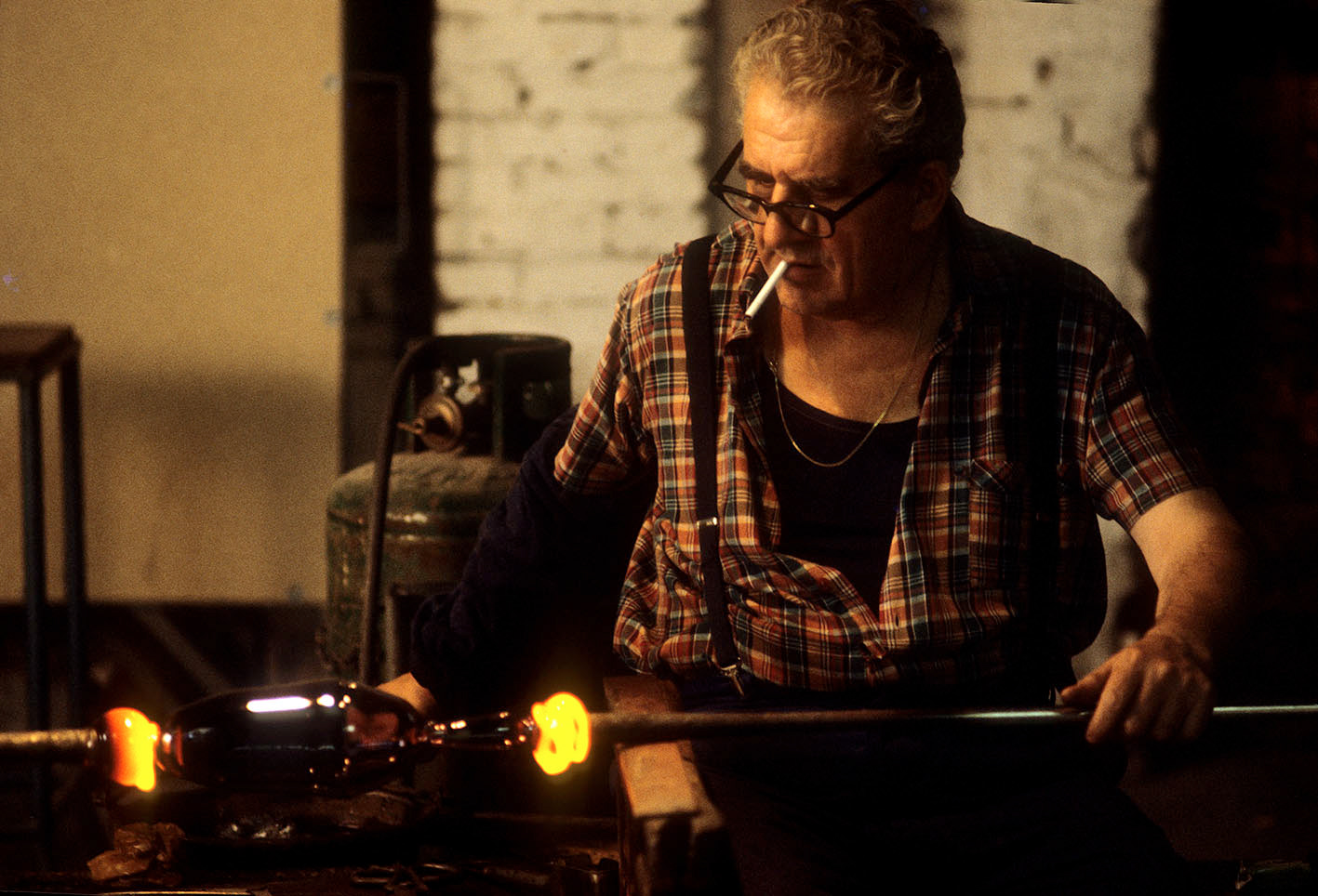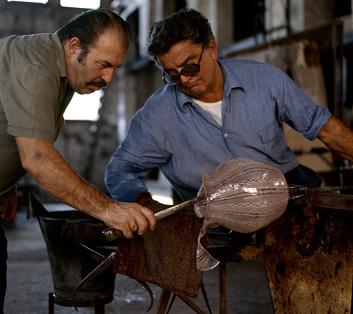 Chiunque abbia potuto entrare in una fornace muranese e assistere alla creazione di un manufatto in vetro, rimane folgorato dal fascino di tecnica, movimenti, gesti che trasformano un fluido apparentemente ingovernabile, in un oggetto modellato e solido, in grado di conservrsi per sempre. Questa magia è quotidianamente rivelata da uomini - e oggi anche qualche donna - che si chiamano vetrai e operano in quest'isola da oltre un millennio, e cioè da quando la Repubblica di Venezia vi trasferì le fornaci che producevano vetro con il fuoco dei forni e che costituivano un rischio mortale per una città in gran parte - e ancor oggi negli edifici storici - edificata col legno. La composizione del vetro di Murano - ricco di sodio - ne rende possibile la lavorazione a caldo e ne permette la soffiatura, la modellazione, e l'aggiunta di impasti colorati, dando luogo a oggetti policromi di grande bellezza e leggerezza. Con i secoli, tecniche e maestria hanno permeddo di creare, oltre a quelli di uso quotidiano (bicchieri, bottiglie, lampade e lampadari)i, ogni sorta di oggetti in vetro soffiato e massiccio., trasformando queste lavorazioni in una produzione "artistica". E di artigianato alto si deve parlare per la qualità - progettuale e esecutiva - che caratterizza questa lavorazione. Ho avuto modo di fotografare molti degli ultimi grandi maestri del Novecento. Spero di riuscire a continuare oggi a raccontare questo "miracolo" che, dall'alba di ogni giorno, viene ancora rinnovato da - ormai poche - centinaia fra maestri, operai, "serventi" nelle "piazze" delle fornaci muraneri. Anche qui, la sfida è quella di rinnovarsi e crescere, formando nuove genereazioni di lavoratori e di desiner.
