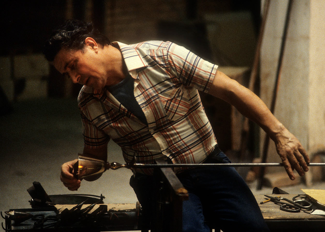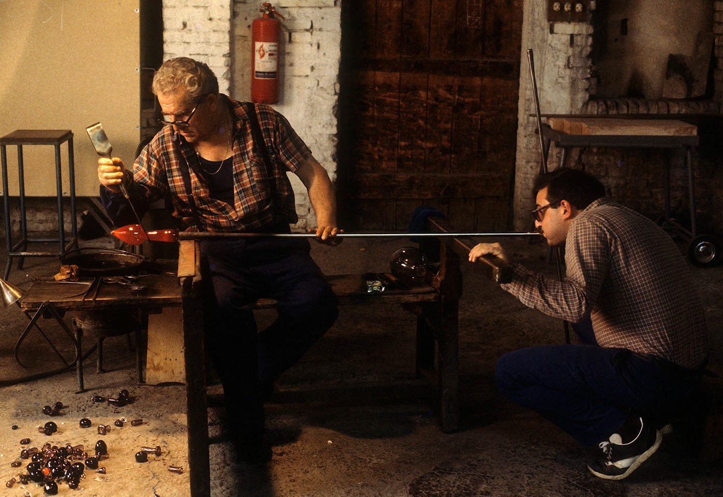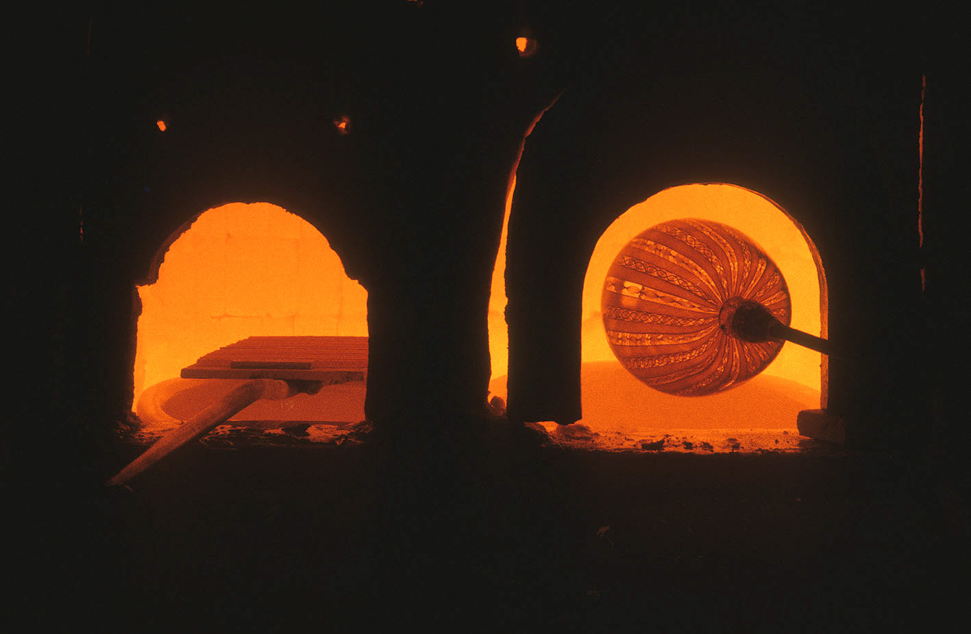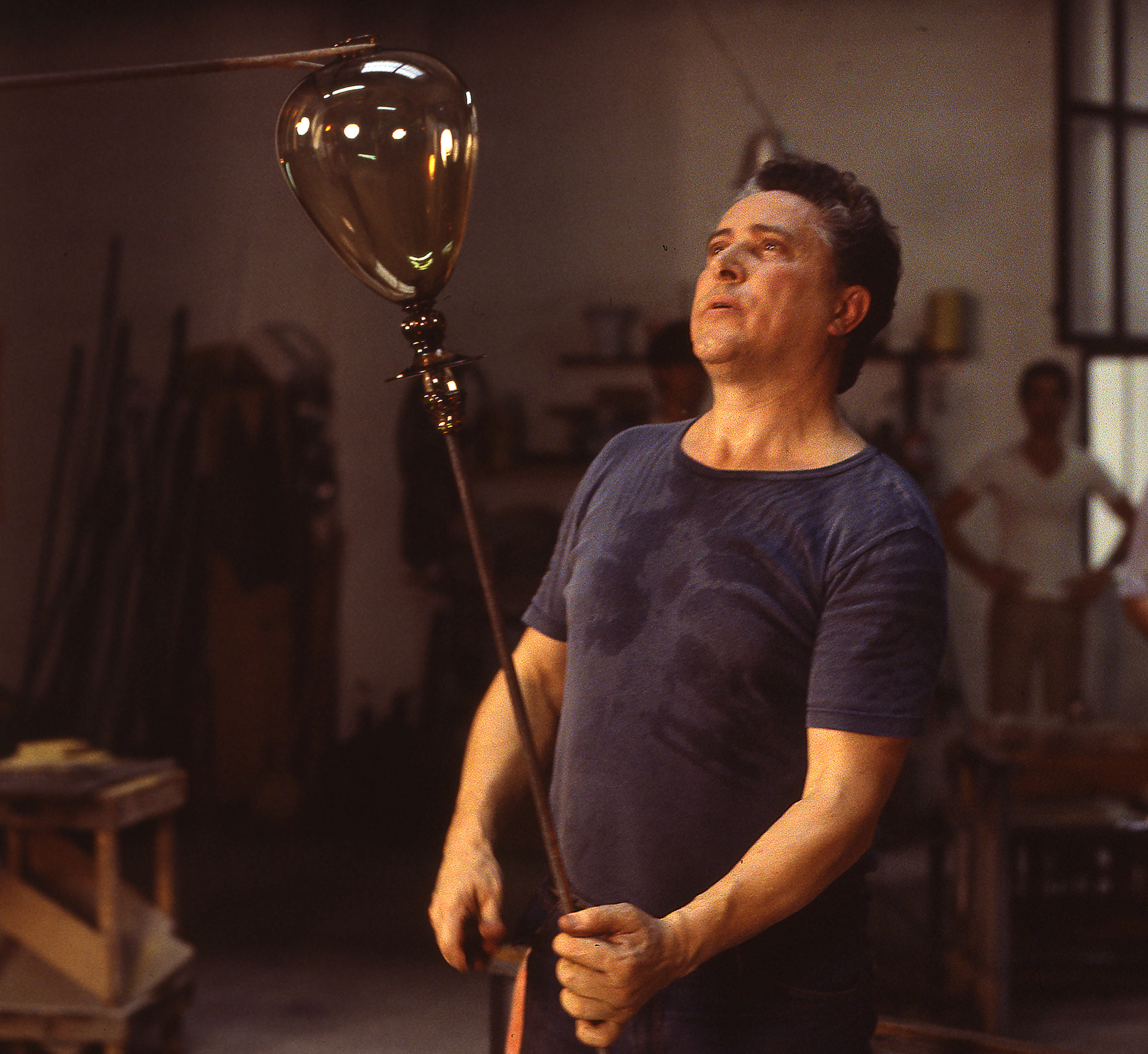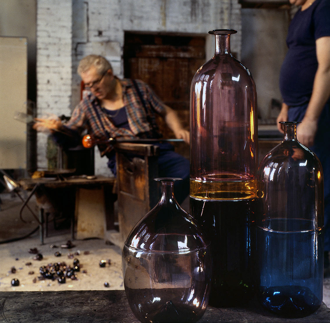 Chiunque abbia potuto entrare in una fornace muranese e assistere alla creazione di un manufatto in vetro, rimane folgorato dal fascino di tecnica, movimenti, gesti che trasformano un fluido apparentemente ingovernabile, in un oggetto modellato e solido, in grado di conservrsi per sempre. Questa magia è quotidianamente rivelata da uomini - e oggi anche qualche donna - che si chiamano vetrai e operano in quest'isola da oltre un millennio, e cioè da quando la Repubblica di Venezia vi trasferì le fornaci che producevano vetro con il fuoco dei forni e che costituivano un rischio mortale per una città in gran parte - e ancor oggi negli edifici storici - edificata col legno. La composizione del vetro di Murano - ricco di sodio - ne rende possibile la lavorazione a caldo e ne permette la soffiatura, la modellazione, e l'aggiunta di impasti colorati, dando luogo a oggetti policromi di grande bellezza e leggerezza. Con i secoli, tecniche e maestria hanno permeddo di creare, oltre a quelli di uso quotidiano (bicchieri, bottiglie, lampade e lampadari)i, ogni sorta di oggetti in vetro soffiato e massiccio., trasformando queste lavorazioni in una produzione "artistica". E di artigianato alto si deve parlare per la qualità - progettuale e esecutiva - che caratterizza questa lavorazione. Ho avuto modo di fotografare molti degli ultimi grandi maestri del Novecento. Spero di riuscire a continuare oggi a raccontare questo "miracolo" che, dall'alba di ogni giorno, viene ancora rinnovato da - ormai poche - centinaia fra maestri, operai, "serventi" nelle "piazze" delle fornaci muraneri. Anche qui, la sfida è quella di rinnovarsi e crescere, formando nuove genereazioni di lavoratori e di desiner.